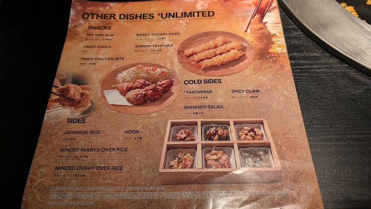 The menu is a meat lover’s paradise, offering a choice between rich sukiyaki and a savory house broth. Start your meal with enticing snacks like fried gyoza and shrimp tempura. For those who crave variety, the cold sides such as seaweed salad and spicy clam complement the main dishes perfectly.